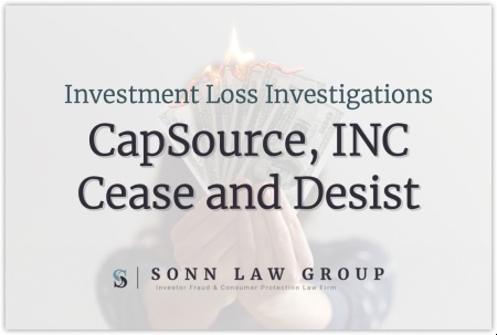 The Sonn Law Group is investigating allegations that CapSource, Inc. sold non-exempt, unregistered securities through unlicensed sales representatives. If you or a family member has suffered losses investing, we want to discuss your case. Please contact us today for a free review of your case.